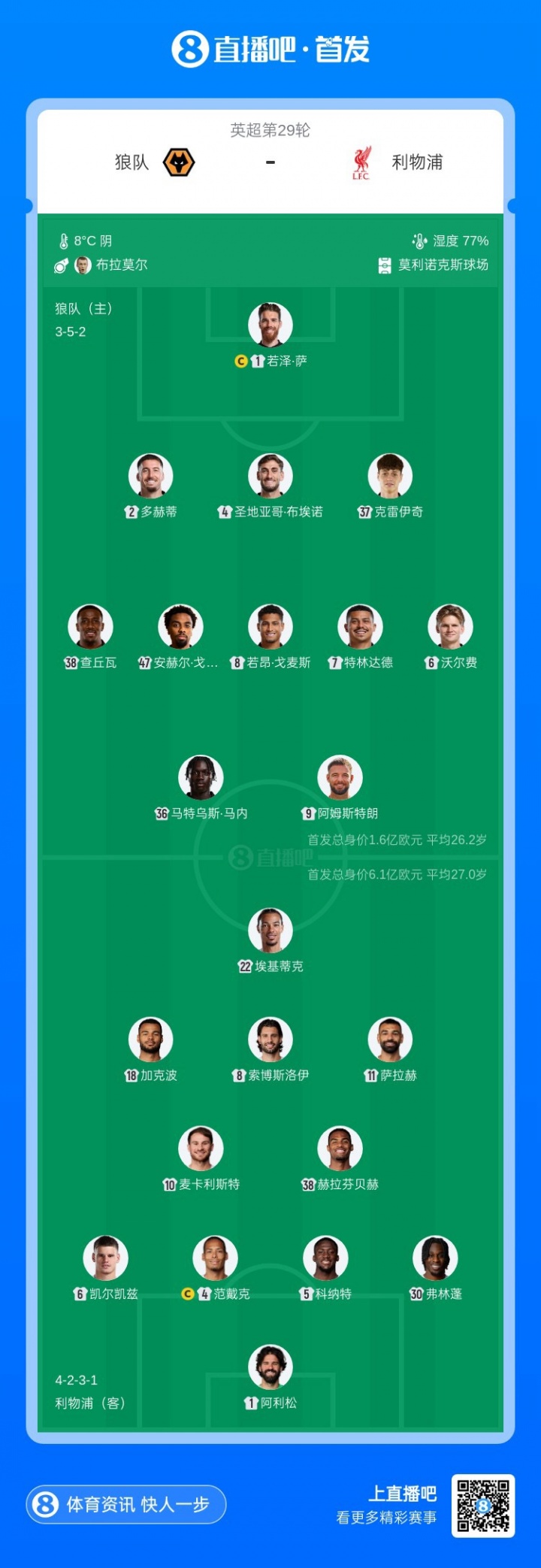 狼队首发:1-若泽·萨、2-多赫蒂、4-圣地亚哥·布埃诺、6-沃尔费、38-查丘瓦、37-克雷伊奇、47-安赫尔·戈麦斯、7-特林达德、8-若昂·戈麦斯、36-马特乌斯·马内、9-阿姆斯特朗